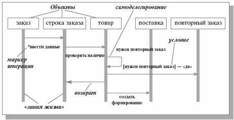 Рис. 3. Элементы и отношения для диаграмм взаимодействий, последовательности и состояний Процесс проектирования с использованием той или иной визуальной нотации принято называть методологией проектирования, и все нотации, предшествующие UML, использовались в рамках соответствующей методологии. Методологию трудно стандартизировать, и UML – это только нотация, которая может использоваться в рамках разных методологий. Одной из таких методологий является Rational Unified Process (RUP) - методология фирмы Rational Software. RUP описывает успешно проверенные на практике подходы к созданию ИС и определяет организацию коллективной работы над проектом на основе следующих принципов: - итерационная разработка проекта, - управление требованиями, - использование компонентной архитектуры, - визуальное моделирование, - тестирование качества ИС, - контроль конфигураций и изменений в ИС. Порядок использования UML диаграмм упрощенно можно представить следующим образом. Вначале для ИС определяется ее внешняя функциональность, выделяются все актеры и все прецеденты. Отношения между ними изображаются на серии диаграмм использования. Дальнейшая работа над проектом "управляется прецедентами". Для каждого прецедента строится описание его динамики в виде серии диаграмм взаимодействия и диаграмм активностей. Из этого описания определяются те объекты, которые задействованы в реализации данного прецедента. Далее диаграммы классов определяют статическую структуру, описывающую взаимоотношения соответствующих объектов друг с другом. Поведение классов, со сложной динамикой реагирования на события, определяется на диаграмме состояний. Размещение объектов по программным модулям описывается в компонентных диаграммах, а программных модулей по сети и компьютерам - в диаграммах распределения. 1.3 Виды диаграмм UML Графические изображения моделей системы в UML называются диаграммами. В терминах языка UML определены следующие их виды: - диаграмма вариантов использования или прецедентов (use case diagram) - диаграмма классов (class diagram) - диаграммы поведения (behavior diagrams) - диаграмма состояний (statechart diagram) - диаграмма деятельности (activity diagram) - диаграммы взаимодействия (interaction diagrams) - диаграмма последовательности (sequence diagram) - диаграмма кооперации (collaboration diagram) - диаграммы реализации (implementation diagrams) - диаграмма компонентов (component diagram) - диаграмма развертывания (deployment diagram) Каждая из этих диаграмм конкретизирует различные представления о модели системы. При этом, диаграмма вариантов использования представляет концептуальную модель системы, которая является исходной для построения всех остальных диаграмм. Диаграмма классов является логической моделью, отражающей статические аспекты структурного построения системы, а диаграммы поведения, также являющиеся разновидностями логической модели, отражают динамические аспекты её функционирования. Диаграммы реализации служат для представления компонентов системы и относятся к ее физической модели. Из перечисленных выше диаграмм некоторые служат для обозначения двух и более подвидов. В качестве же самостоятельных представлений используются следующие диаграммы: вариантов использования, классов, состояний, деятельности, последовательности, кооперации, компонентов и развертывания. Для диаграмм языка UML существуют три типа визуальных обозначен