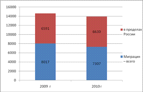 Рис.3. Из данного графика мы можем сделать вывод, что миграционный прирост в 2010 году резко упал. ЗАКЛЮЧЕНИЕ Итак, любое территориальное перемещение, совершающееся между разными населенными пунктами одной или нескольких административно-территориальных единиц, независимо от продолжительности, регулярности и целевой направленности представляет собой миграцию в широком значении этого слова. Трудовые миграции являются определяющими в общей совокупности территориальных перемещений; переселения — это конечный, законченный вид миграции. Миграция населения — общественное явление. Миграция населения — столь же древнее явление, как и человек — сгусток всех общественных отношений. До появления человека территориально перемещались его человекообразные предшественники. Но эти перемещения предполагали поиск данных природой предметов потребления, а не условий труда для их производства. В этом принципиальная разница между миграциями любых популяций животного мира и миграцией населения. Миграция как пространственное движение населения свойственна всем человеческим обществам. Однако интенсивность, направленности и состав миграционных потоков, ее социальные, экономические и демографические последствия существенно различаются не только в разные исторические эпохи, но и в странах с разным общественным строем, уровнем экономического развития и его территориальной дифференциацией, природно-климатическими условиями и структурой населения. Во второй главе мы рассмотрели основные показатели миграции. Мы выяснили также, что для анализа миграции используется ряд методов: прямых – путем регистрации каждого отдельного передвижения (прибытия и выбытия) или путем регистрации места рождения; косвенных - методы измерения миграции по данным о продолжительности проживания в определенном месте, о предыдущем месте жительства; методы математической статистики; методы выборочного статистического изучения безвозвратной и возвратной миграции; социологические методы. В третьей главе мы выполнили расчет этих показателей для Орловской области. И выявили закономерность снижения миграционного оттока населения. А также проанализировали миграционную ситуацию в Орловской области. СПИСОК ЛИТЕРАТУРЫ: 1. Переведенцев В. И., Методы изучения миграции населения, М., 1975. 2. Переведенцев В. И., Рабочая книга социолога, М., 1976. 3. Переведенцев В. И., Социальные факторы и особенности миграции населения СССР. М., 1973. 4. Хорев Б.С., Чапек В. Н. Проблемы изучения миграции населения. - М., 1978. 5. Хомра А. У. Миграция населения. - Киев, 1979. 6. Чапек В.Н. Миграция и стабилизация трудовых ресурсов. - Ростов-на-Дону, 1983. 7. Моисеенко В.М. Территориальное движение населения. - М., 1985. 8. Бреев Б.Д. Подвижность населения и трудовые ресурсы. - М., 1977. 9. Назарова Е. А. Особенности современных процессов миграции// Социс. -2000. - N1 – c/ 106-110. 10. Баинова С. Миграция населения РБ (сб. № 02-03-02) – Улан-Удэ. Бурятстат, 2006. 11. статья с сайта http://economy.buryatia.ru/ “О миграционном процессе в Республике Бурятия по итогам 1 полугодия 2007 года” |