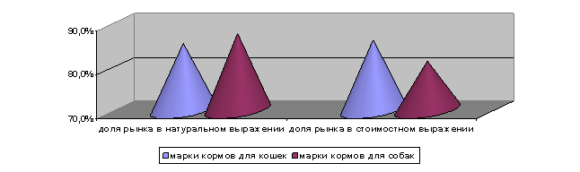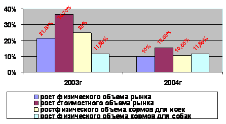 Обзор российского рынка кормов для домашних животных. По числу домашних животных на душу населения Россия занимает второе место в мире после США. Наиболее популярный вид домашней живности в нашей стране — кошки, их у нас от 25 до 30 миллионов. На втором месте — собаки, их около 20 миллионов. По данным, приводимым компанией «Комкон», в 2003 году приблизительно треть российских семей (32%) держала кошек, и только пятая часть россиян (17,5%) — собак. Рынок кормов для домашних животных сформировался в России около пятнадцати лет назад и в настоящее время активно развивается. Так, в 2003 году в нашей стране объем продаж кормов вырос на 22%, а в 2004 году составил свыше 200 млн. долларов США (по данным компании Mars). Эксперты Mars считают, что при сохранении таких темпов развития категории через 3-4 года объем рынка может составить порядка 500 млн. долларов США. По оценкам экспертов, в прошлом году общий объем рынка составил около 450 миллионов долларов США. Возможно, что активная пропаганда готовых кормов позволит в этом году достичь 15-процентного роста продаж, соответственно, общегодовой объем достигнет порядка полумиллиарда долларов. Не исключено, однако, что подобные прогнозы так и останутся прогнозами, если производителям кормов не удастся убедить костяк своих покупателей – заводчиков. В 2005 году российский рынок составил более 11,9 млрд. рублей (400—450 млн. долларов США). Причем 21% этих денег россияне потратили на корм для собак, а почти 79% — на кошачьи «сухарики» и консервы. На рисунке 1 представлена диаграмма соотношения количества расходов россиян на корм для собак и кошек. Рисунок 1. *по данным компании ACNielsen январь 2005г. http://www.yauza.com Как утверждают эксперты ACNielsen, российский рынок кормов для животных демонстрирует стабильный рост, однако темпы его развития снижаются. На рисунке 2 показана диаграмма колебания роста российского рынка кормов для животных. Во многом снижение темпов роста рынка связано с тем, что владельцы домашних животных в России пока не спешат переводить своих питомцев исключительно на готовые корма. Сегодня лишь треть владельцев предпочитает кормить домашних животных готовыми кормами. Остальные кормят «по старинке». Рисунок 2. **по данным компании ACNielsen январь 2005г. http://www.yauza.com Из диаграммы, представленной на рисунке 2, видно, что в 2003 году рынок кормов для домашних животных вырос в физическом объеме на 21,5%, а в 2004 году рост составил лишь 10,5%. В стоимостном выражении объем рынка в 2003 году увеличился на 36,7%, в 2004-м — на 15,6%. Такой существенный спад темпов роста произошел за счет кормов для кошек, в 2003 году рост физического объема этого сегмента составил 25%, а в 2004-м — всего 10,6%. Зато рынок кормов для собак остается стабильным — по 11,5% роста и в прошлом, и в позапрошлом годах. Как полагают эксперты, снижение продаж кошачьих кормов могло стать следствием перенасыщения этого сегмента рынка. Не исключено, что свою скромную лепту в этот процесс внесли и отечественные производители дешевых кормов, появившиеся на рынке в последние два-три года. Но как бы то ни было, их доля все еще остается мизерной, и пока они не представляют серьезной угрозы для лидеров. Ведущими игроками рынка кормов для животных являются транснациональные компании, 80% кормов которых производятся и продаются в России. Это Mars, Aller Petfood, Nestle Purina и Royal Canin. Хотя зарубежные производители уверенно 