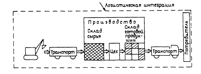 Следует отметить, что совместное решение отдельных задач по управлению материальными потоками намного сложнее их обособленного решения. Здесь зачастую требуются иные методы, а также иная подготовка специалистов. Второй этап в развитии логистики приходится на 80-е годыXX века. В этот период интеграционная основа логистики расширилась и стала охватывать производственный процесс. С точки зрения развития логистики 80-е годы характеризуются следующим: — быстрый рост стоимости физического распределения: — рост профессионализма менеджеров, осуществляющих управление логистическими процессами; — долгосрочное планирование в области логистики; — широкое использование компьютеров для сбора информации и контроля за логистическими процессами; — централизация физического распределения; — резкое сокращение запасов в материалопроводящих цепях; — четкое определение действительных издержек распределения; — определение и осуществление мер по уменьшению стоимости продвижения материального потока до конечного потребителя Графически глубина логистической интеграции, достигнутая в 80 - е годы, представлена на рис. 7.