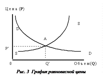 По мере повышения цены предложения возрастает число продавцов ( производителей) и объем предложения на рынке.[15, Стр.179-182] Главным фактором, влияющим на спрос и предложение, является цена. Вместе с тем существует обратная зависимость: взаимодействие спроса и предложения формирует цену. Различают два различных подхода к определению цены: марксистский и рыночный. Согласно первому подходу цена — денежное выражение стоимости товара, причем стоимость определяется затратами труда на производство товара. В рамках рыночного подхода цена — это форма выражения ценности (полезности) благ, проявляющихся в процессе их обмена. Если государство не вмешивается в рыночный механизм, т.е. не вводит контроль за ценами, то спрос и предложение на конкурентном рынке придут в равновесие и установятся рыночная цена товара и общий объем производства. Равновесие возникает при таких ценах и при таких количествах товаров, при которых конкурентные силы сбалансированы, т.е. когда количество товаров, которое хотят купить покупатели, соответствует количеству товаров, которое продавцы хотят продать. В результате образуется равновесная цена — цена такого уровня, когда объем предложения соответствует объему спроса.[15, стр. 195-197]