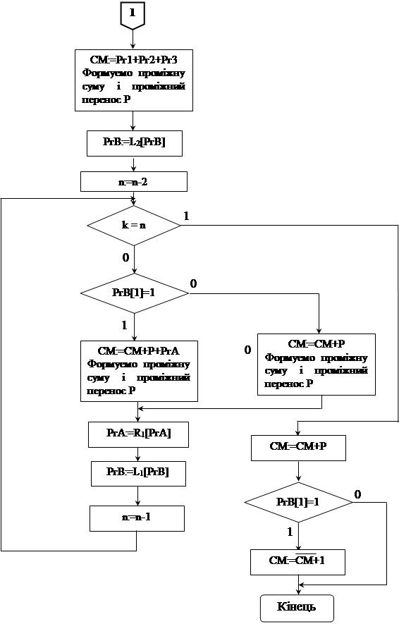 Описання блок-схеми алгоритму Спочатку виконуємо ініціалізацію: - в суматор заносимо 0; - в регістр Рг1 заносимо 0; - в регістр Рг2 заносимо 0; - в регістр Рг3 заносимо 0; - в лічильник n заносимо 8; - у перші 8 розрядів регістра РгА заносимо доповняльний код числа А; - в регістр РгВ заносимо доповняльний код числа В; Перевіряємо знак числа В (РгВ[0]), якщо він рівний 1 (від’ємне) то в регістр Рг1 заносимо доповняльний код числа А. Зсуваємо регістр РгА вправо на один розряд. Дивимося на старший розряд числа В (РгВ[1]), якщо там 1 то заносимо в регістр Рг2 значення регістра РгА (першій частковий добуток). Зсуваємо регістр РгА вправо на один розряд. Дивимося на другий розряд числа В (РгВ[2]), якщо там 1 то заносимо в регістр Рг3 значення регістра РгА (другий частковий добуток). Зсуваємо регістр РгА вправо на один розряд. Додаємо в суматорі значення з регіс-трів Рг1, Рг2, Рг3 та формуємо проміжну суму та проміжний перенос Р. Зсуваємо регістр РгВ вліво на два розряди. Зменшуємо значення лічильника на 2. Далі починаємо цикл: Поки n не дорівнює 0 дивимося на старший розряд числа В (РгВ[1]), якщо там одиниця додаємо до суматора (попередня проміжної суми) вміст регістра РгА (черговий частковий добуток) та попередній проміжний перенос Р, якщо ж 0, то додаємо лише попередній проміжний перенос Р; формуємо чергову проміжну суму та проміжний перенос. Зсуваємо регістр РгА вправо на один розряд. Зсуваємо регістр РгВ вліво на один розряд. Зменшуємо значення лічильника на 1. Повторюємо цикл. Після закінчення циклу додаємо до суматора (останньої проміжної суми), з розповсюдженням переносу, останній проміжний перенос Р. Дивимося на знак результату (СМ[0]), якщо там 1 (результат від’ємний), перетворюємо доповняльний код в прямий: інвертуємо суматор і додаємо 1. Операцію множення виконано результат знаходиться в суматорі. 1.3 Приклад множення Візьмемо для прикладу помноження два числа: A=0,69140625 та B= -0,80078125. Переведемо ці числа в двійкову систему числення:А2 =0.10110001; Адоп =0.10110001; В2 =1.11001101; Вдоп =1.00110011. Розглянемо приклад помноження цих чисел, за допомогою алгоритму: