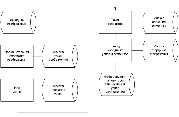 Рис. 1.1 Процесс обработки изображения начинается с его фильтрации. На входе системы имеется изображение, полученное каким-либо способом и еще не подготовленное к обработке. На данном этапе в зависимости от состава изображения выполняется подбор фильтров для обработки изображения. С помощью различного рода выбранных фильтров устраняются случайные помехи, лишние точки, не несущие информации о структурных элементах изображения, выделяются основные элементы. Данная обработка осуществляется в подсистемах формирования центроидных фильтров и центроидной фильтрации. После фильтрации изображение можно подвергать дальнейшей обработке в следующих подсистемах: - подсистема центроидной релаксации, которая осуществляет выделение кривых, углов, окружностей, определение их геометрических характеристик; - подсистема линейной сегментации, выполняющая обработку пересекающихся линий, образующих узлы и сегменты; - подсистема цепного кодирования, позволяющая в дифференциальном кодированном виде представить линии; - подсистема визуализации, осуществляющая графическое представление файлов описания изображения, полученных в результате работы подсистем распознавания изображений. 1.1.2. Обоснование цели создания системы Количество информации, обрабатываемой на ЭВМ, неизменно увеличивается. Это связано и с увеличением требований к качеству данных, и с увеличением объемов самих данных, обусловленным научно-техническим прогрессом. Несмотря на непрерывное увеличение производительной мощности рабочих станций, каналов передачи данных, массивов хранения информации, вычислительных ресурсов не всегда бывает достаточно для своевременной и качественной обработки информации. В результате происходит увеличение объемов обрабатываемой информации за счет ухудшения ее качества. При обработке графических данных постоянно возникают вопросы, связанные с требованиями к электронно-вычислительным ресурсам. Графические изображения всегда требовали обработки больших объемов данных. Необходимо иметь возможность оптимизировать ресурсоемкие операции по обработке изображений за счет разработки алгоритмов анализа и понимания данных, представленных в растровом виде, позволяющих получать описания этих данных, приводя их к векторному виду. Векторная и кодированная формы представления информации имеют ряд преимуществ: - значительное уменьшение объемов хранимой информации; - увеличение скорости и качества синтеза изображений; - аккумуляция информации с целью последующего использования. 1.1.3. Назначение «Подсистемы линейной сегментации» В процессе обработки любого графического изображения возникает необходимость выделения его структурных единиц. Одними из основных таких единиц являются различного рода линии, присутствующие почти в каждом изображении. Линии, в свою очередь могут пересекаться, разделяясь таким образом на сегменты и образуя узлы пересечения. Выявление узлов и сегментов является важной задачей анализа любого изображения. Данная подсистема предназначена для автоматизации алгоритма нахождения узлов и линий на растровом изображении, преобразуя точки растра в координаты узлов и сегментов линий, образованных ими. 1.1.4. Характеристика организационной и функциональной структуры Для синтеза изображения требуется наличие опис