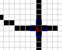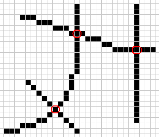 где (x,y) – координаты рассматриваемой точки; M и N – ширина и высота изображения; B – массив узлов, размерность MxN; n – номер обрабатываемого узла. На рис. 2.3 приведен пример пересечения линий, где выделенные точки являются узловыми. Поиск узловых элементов заключается в последовательном переборе элементов массива точек. Однако при пересечении линий, показанном на рис. 2.4, точки, соседствующие с узлом, имеют также количество соседей, большее двух, возникает ситуация «размытости» узловой точки. Данная проблема может быть решена вычислением центра узла, координаты которого могут быть получены с помощью вычисления среднего арифметического всех точек, принадлежащих узлу. Пример пересечения линий