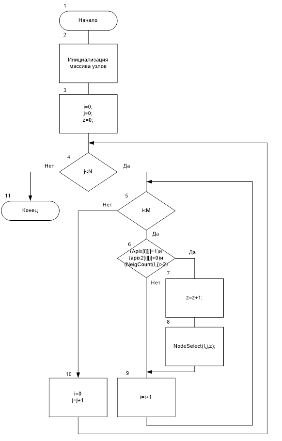 Рис. 2.4 2.1.5. Специальные требования к техническому обеспечению Требования к техническому обеспечению для решения задачи «Поиск узлов» полностью совпадают с требованиями к комплексу технических средств, предъявленными при разработке подсистемы «Линейная сегментация» (см. п. 1.3.1). Реализация задачи возможна при наличии набора следующих технических средств: - персональный компьютер IBM PC с процессором не ниже Pentium I; - клавиатура; - монитор; - жесткий диск с объемом свободного пространства не менее 50 МБ; - оперативная память объемом не менее 128 МБ. Работа программы возможна только на ЭВМ, которые поддерживают 32-разрядные операционные системы семейства Windows, такие как Windows 95, WindowsNT или выше. Как указано выше, работа может вестись на ЭВМ с процессором не ниже Intel Pentium. Но желательно использовать ЭВМ с процессором не ниже класса Intel Pentium II, который работает более эффективно. 2.2. Описание алгоритма «Поиск узлов» 2.2.1. Назначение и характеристика Алгоритм «Поиск узлов» предназначен для поиска узловых точек в элементах изображения. Он представляет собой последовательный обход массива точек с рекурсивным определением узловых областей и последующим заполнением массива узлов. 2.2.2. Используемая информация В качестве входной информации используется двухмерный массив точек, представляющий описание входного изображения, описанного в пункте 1.3.2. Алгоритм формирует значения элементов массива узлов, содержащихся на изображении с указанием номера каждого узла для последующей их идентификации. Данная информация является промежуточной и предназначена для использования в других задачах подсистемы: при распознавании сегментов линий и выводе окончательных результатов. Алгоритм решения составлен с учетом математического описания, приведенного в пункте 2.1.4. Алгоритм представляется в текстовом виде следующим образом: 1. Начало; 2. Инициализация массива узлов; 3. i=0; j=0; z=0; 4. Если j>=N, то переход к п.11; 5. Если i>=M, то переход к п.10; 6. Если (apix[i][j]=1)и(apix2[i][j]<0)и(NeigCount(i,j)>2), то переход к п.7, иначе к п.9; 7. z=z+1; 8. NodeSelect(i,j,z); 9. i=i+1; переход к п.5; 10. i=0; j=j+1; переход к п.4; 11. Конец. Для контрольного примера необходимо подобрать такое изображение, чтобы оно охватывало различные типы пересечений. Изображение не должно содержать цикличных элементов: замкнутых линий, сплошных закрашенных областей, в противном случае может произойти неправильное распознавание узлов. В таблице 2.1 представлены условные обозначения, введенные в тексте подраздела Таблица 2.1 Условные обозначения