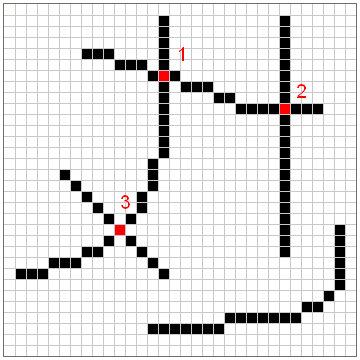 Рис. 4.3 Выделенные узлы имеют координаты 1: (14,25) 2: (25,22) 3: (10,11) Разобьем линии на изображении на сегменты. В результате разбиения можно выделить 11 сегментов линий. На рис. 4.4 выделен сегмент, не имеющий пересечений. Ни одна из образующих его точек не является узловой. Для передачи координат точек такого сегмента в подсистему цепного кодирования достаточно указания одной из координат. На рис. 4.5 выделены 8 сегментов, одна из крайних точек которых является узлом. Для идентификации такого сегмента линии необходимо указать координаты начала сегмента и координаты узла, в котором завершается данных сегмент. На рис. 4.6 выделены 2 сегмента, обей крайних точки которых являются узлами. При кодировании такого сегмента в подсистеме цепного кодирования возникает неопределенность направления кодирования, поэтому для устранения данной проблемы было принято указывать еще одну точку, определяющую направление кодирования сегмента. Сегмент, не имеющий пересечений
