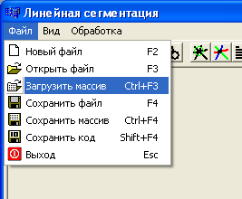 Рис. П.2.1 Для открытия файла, содержащего входное изображение следует выбрать в меню «Файл» пункт «Открыть файл» или «Загрузить массив» для получения изображения из файла формата BMP или файла массива точек соответственно (рис. П.2.2). Далее в диалоге выбора файла следует выбрать необходимый файл или ввести его имя и нажать кнопку «Открыть». После этого файл будет загружен и из него будет сформирован массив точек исходного изображения. Меню «Файл»