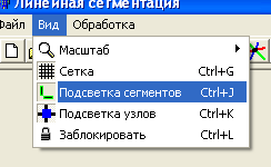 Рис. П.2.6 После выполнения обработки изображения ее результаты могут быть просмотрены на самом исходном изображении. Для этого следует воспользоваться пунктами-переключателями меню «Вид» (рис. П.2.7). Пункт «Сетка» позволяет включить или выключить отображение сетки изображения при его увеличении. Пункт «Подсветка линий» позволяет включить или выключить подсветку сегментов линий при наведении указателя мыши на различные области изображения (для данного режима требуется предварительное выполнение процедуры «Поиск сегментов»). Пункт «Подсветка узлов» позволяет включить или выключить подсветку узлов при наведении указателя мыши на различные области изображения (для данного режима требуется предварительное выполнение процедуры «Поиск узлов»). Пункт «Заблокировать вид» позволяет зафиксировать выделенные элементы изображения, не изменяя подсветку при перемещении курсора мыши в области изображения. Меню «Вид»