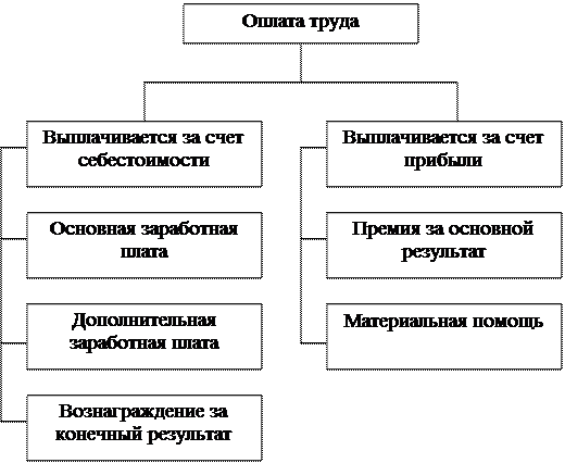 Рисунок 1 – Структура оплаты труда наемного работника На рисунке 1 отражено что, оплата труда наемного работника выплачивается за счет себестоимости и за счет прибыли, а также состоит из основной и дополнительной заработной платы, премии, вознаграждений за конечный результат и материальной помощи. Основная заработная плата – это плата за отработанное время, она включает в себя: заработную плату по сдельным расценкам, тарифным ставкам, окладам (прямая заработная плата); доплаты и надбавки к тарифным ставкам за профессиональное мастерство, совмещение профессий и должностей; компенсационные выплаты, связанные с режимом работы и условиями труда и так далее. Дополнительная заработная плата – это выплата за неотработанное время и включает в себя следующие виды материальных вознаграждений: ежегодные и дополнительные отпуска; льготные часы подростков; простои не по вине работников; вынужденные прогулы и другое. Вознаграждения за конечный результат выплачивается из фонда оплаты труда за достижения определенных результатов деятельности организации и ее структурных подразделений. К таким вознаграждениям относятся: увеличение объема товарной продукции (работ, услуг); рост производительности труда (выработки); повышение качества продукции (работ, услуг) и другие виды достигнутых результатов. Премия за основные результаты стимулирует достижение конечных результатов организации, структурного подразделения, выплачивается из прибыли организации. Материальная помощь выплачивается из фонда материального поощрения за счет прибыли и имеет целью обеспечение социальных гарантий и благ для наемных работников за счет организации, то есть компенсационные выплаты в чрезвычайных или экстремальных ситуациях: смерть работника организации или его близких родственников; свадьба работника организации или его близкого родственника; для приобретения лекарств или платного лечения работника организации и так далее /5, с. 116/. 1.3.2 Формы и системы оплаты труда Формы и системы оплаты труда призваны обеспечить учет в заработной плате количественных и качественных результатов труда, создавать у работников материальную заинтересованность в улучшении непосредственных результатов своей работы и общих итогов деятельности предприятия (организации). Под формой заработной платы понимается способ начисления работнику заработной платы. Формы и системы оплаты труда различаются порядком начисления заработной платы в зависимости от его результативности. Существует тарифная система оплаты труда, которая представляет собой совокупность нормативных материалов, регулирующих уровень основной заработной платы в зависимости от квалификации, условий труда, должности работника, размеров предприятия. Она является инструментом, с помощью которого практически учитывается большинство принципов организации заработной платы. Тарифная система разрабатывается государственными органами управления и рекомендуется для применения на предприятиях. Субъекты хозяйствования самостоятельно принимают решение о полном или частичном использовании рекомендаций. Государство устанавливает размер прожиточного минимума, ниже которого оплата труда опускаться не может. Тарифная система включает: тарифную ставку (часовую или месячную); тарифные коэффициенты по р