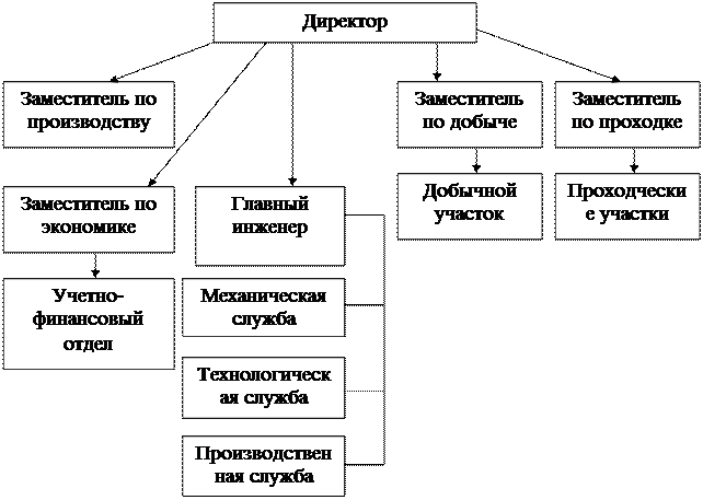 Рисунок 2 – Организационная структура предприятия Решение о строительстве данной шахты на горном отводе ОАО «Разрез Сибиргинский» было принято Советом директоров Угольной Компании «Южный Кузбасс» 25 мая 1999 г., строительство началось в ноябре 1999 г., а 14 ноября 2002 года был подписан акт государственной комиссии о сдаче шахты в эксплуатацию. Генеральным проектировщиком был утверждён институт «Гипроуголь». Специалистами института в очень короткий срок были выданы основные технические решения, обеспечивающие производственную мощность первой очереди шахты 1,2 млн. тонн угля в год. За короткое время на промплощадке шахты были построены: котельная, состоящая из трёх транспортабельных блоков КМТ-2.5; вентиляторная установка в блоке с калориферной, состоящая из четырёх вентиляторов ВЦ-15 (два в работе, два в резерве); противопожарная насосная станция в блоке с двумя резервуарами по 400 м³; ЦРП 6/6/0.4. За прошедшие три года было пройдено более 13 км горных выработок и выдано на гора 368 тыс. тонн угля попутной добычи, в том числе: стволов (путевой, конвейерный, вентиляционный фланговый) - 4 км.; фланговые уклоны - 1 км.; выработок лав 3-1-1 и 3-1-3 – 7 км.; прочих - 1,3 км. Для проходки горных выработок были использованы: комплект проходческого оборудования фирмы «Джой»; проходческие комбайны ГПКС Копейского завода; проходческий комбайн П-110 Новокраматорского завода; самоходные вагоны 5ВС15; крепление выработок производилось в основном анкерной крепью, сечение выработок от 16 до 19 кв. м. В процессе проектирования и строительства шахты был налажен тесный контакт с учёными Сибирского филиала ВНИМИ и научно-исследовательского проектно-конструкторского подразделения КузГТУ "Угольные технологии Кузбасса". В производственных успехах шахты немаловажную роль играют огромное чувство ответственности за порученное дело и высокие нравственные качества руководителя предприятия Агудалина Бориса Петровича. Его авторитет является залогом высокой трудовой и производственной дисциплины, которая царит в этом коллективе. В 2003 году, под руководством начальника участка Коженова О.А., был смонтирован и введен в эксплуатацию очистной механизированный комплекс 2КМК – 800У. В течение ноября-декабря 2003 года механизированный комплекс был освоен, и с начала 2003 года бригада встала на миллионный режим работы по добыче угля. Успешно отработав первую лаву 3–1–1, добыв 642630 тонн угля бригада произвёла ускоренный перемонтаж механизированного комплекса из лавы 3–1–1 в лаву 3–1–3 и уже в декабре 2003 года она выдала свой первый миллион тонн угля. За достигнутые показатели бригада Малюка О.П. получила право носить почетное звание «Бригада-миллионер». Внедрение современного оборудования нового поколения позволило довести нагрузку на очистной забой до 125 000 тонн угля в месяц, против максимально достигнутой по Томусинскому руднику в условиях тяжелой кровли пласта III - 60 000 тонн/месяц, с выходом в 2003 году на объём добычи до 1500 тыс. тонн. В 2004 году добыча по шахте была увеличена до 1,6 млн. т. за счёт ввода в эксплуатацию зарезервированных запасов между шахтой и разрезом «Сибиргинский» и ввода нового оборудования. Эти запасы были освоены при помощи камерно-столбовой системы без нарушения дневной поверхности. Работы велись при помощи проходческо – очистного комплекса фирмы «JOY» включающего в себя