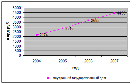 Рис. 2.1. «Структура внутреннего государственного долга» Источник: [4]. Следует отметить, что Национальный банк Республики Беларусь в рамках реализации денежно-кредитной политики выпускает свои ценные бумаги (краткосрочные облигации). Эмиссия начата банком с 1995 года. Ценные бумаги Национального банка не предназначены для кредитования бюджетного дефицита, а являются средством денежно-кредитного регулирования. Целями развития рынка государственных ценных бумаг являются: · закрепление положительных тенденций по стабилизации денежно-кредитных отношений; · расширение безинфляционного покрытия денежного дефицита государственного бюджета за счет эмиссии высоколиквидных ценных бумаг; · дальнейшее развитие вторичного рынка ценных бумаг. Операции на открытом рынке с государственными ценными бумагами производятся также для управления ликвидностью банковской системы. Ценные бумаги государства делятся на две группы: · бумаги, которые могут обращаться на вторичном рынке; · бумаги, не поступающие на вторичный рынок. На вторичный рынок поступают казначейские векселя (обязательства) и облигации. Казначейские обязательства (векселя) государства – вид ценных бумаг, удовлетворяющих внесение их держателями денежных средств в бюджет и дающих право на получение фиксированного дохода в течение срока владения ими. Не обращаются на вторичном рынке сберегательные облигации; облигации (или другой вид ценной бумаги), оформляющие внешний долг; облигации органов власти. Выпуск долгосрочных государственных облигаций Республики Беларусь осуществляется с целью снижения темпов инфляции и исполнения республиканского бюджета по расходам со сроком обращения один год и более. Министерство финансов определяет объем, дату выпуска облигаций, срок обращения и погашения, номинальную стоимость одной облигации, процентную ставку. Объемы эмиссии учитываются при формировании республиканского бюджета. Долгосрочные облигации представляют собой источник не инфляционного финансирования дефицита государственного бюджета. С их помощью можно цивилизованным путем отсрочить выплаты по существующему государственному долгу, увеличить сроки государственных заимствований, снизить неплатежи в стране. По состоянию на начало 2008 года в обращении находится облигаций Минфина, номинированных в белорусских рублях, на сумму 2845,3 млрд. рублей, Национального банка на сумму 232,9 млрд. рублей. Объем средств, инвестируемых в государственные ценные бумаги, снизился на 43%, в краткосрочные облигации Национального банка - на 40% . Несмотря на положительную динамику номинальной доходности, реальная доходность по облигациям правительства снизилась на 0,33 процентных пункта, по облигациям Национального банка – на 0,17 процентных пункта. Если проследить динамику изменения внутреннего государственного долга за период с 2004 года по 2007 год, можно отметить что наблюдается увеличение внутренней задолженности государства. По отношению к 2004 году внутренний государственный долг увеличился более чем в два раза, а по отношению к 2007 году вырос на 17%. Данная динамика отображена на рис. 2.2.