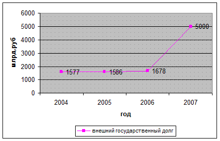Рис. 2.2. «Динамика увеличения внутреннего государственного долга РБ за 2004-2007 года» Источник: [4]. Таким образом, на начало 2008 года размер внутреннего государственного долга составил 4438 млрд. руб. Внутренний государственный долг Беларуси за январь-июнь 2008 года сократился на 0,2% и составил на начало июля Br 6234,9 млрд. В том числе задолженность, гарантированная правительством, уменьшилась на 1,2% до Br 1785,6 млрд. и составила 28,6% всего внутреннего долга. Задолженность центрального правительства составила Br 4449,3 млрд., увеличившись за полугодие на 0,2% [9]. Быстрый рост внутреннего государственного долга требует изыскания дополнительных доходных источников. Чтобы не допускать негативного воздействия государственного долга на экономику, необходимо грамотно управлять государственным кредитом и контролировать формирование и погашение государственного долга. 2.3. Анализ внешнего государственного долга Внешний государственный долг – совокупность экономических отношений, возникающих в процессе совершения государственно-кредитных операций, в которых государство выступает на мировом финансовом рынке в роли заемщика, кредитора или гаранта. Эти экономические отношения принимают форму государственных внешних займов, которые предоставляются на принципах возвратности, срочности и платности. Получателями внешних займов в Республике Беларусь являются Правительство Республики Беларусь и местные органы власти. Кредиторами во внешнем государственном кредите выступают правительства и юридические лица иностранных государств, международные финансовые организации, а также частные лица-нерезиденты. Внешний государственный долг нашей страны складывается из суммы основного долга Республики Беларусь и ее резидентов по внешним государственным займам по состоянию на определенный момент времени. В соответствии с законодательством внешние государственные займы Беларуси могут привлекаться в виде: · иностранных кредитов, предоставляемых республике; · иностранных кредитов ее резидентам, выдаваемых под государственную гарантию; · займов, получаемых от размещения на внешних финансовых рынках государственных ценных бумаг в качестве государственных долговых обязательств. Расходы за счет финансовых ресурсов, дополнительно привлекаемых с помощью государственного кредита, увеличивают внутренний и внешний долг государства. Его абсолютная величина и динамика изменений характеризуют состояние экономики и результативность государственно-кредитных операций. Главные задачи системы управления внешним долгом: · обеспечение национальной экономики республики внешними источниками финансирования, достаточными для ее оптимального развития; · осуществление контроля за эффективным использованием этих средств и за тем, чтобы их объем находился в соответствии с реальными возможностями страны обслуживать свой внешний долг. Наиболее значимым источником внешнего финансирования в нашей стране являются иностранные кредиты под гарантии Правительства Республики Беларусь по межправительственным, межбанковским соглашениям, а также по линии международных финансовых организаций. Основными источниками привлечения заимствований на государственном уровне или кредитов на уровне предприятий под гарантии правительства являются Россия, Китай, Иран и Вен
