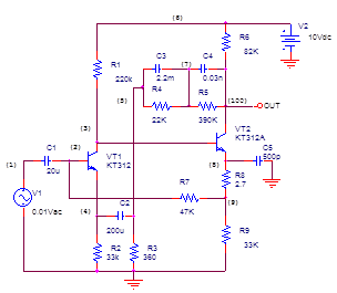 Варианты заданий. Вариант 1. Тема: Моделирование и анализ усилителя-корректора. Виды анализа: анализ по переменному току; временной анализ; анализ шумов; анализ Фурье; статистический анализ. Технические характеристики усилителя-корректора. Коэффициент усиления 40дБ. Номинальное входное напряжение 2,5мВ. Входное сопротивление 47кОм. Напряжение питания ±15В. Потребляемый ток £12мА. Рабочая температура +10…+35. Вариант 2. Тема: Моделирование и анализ усилителя. Виды анализа: анализ по переменному току; временной анализ; анализ шумов; анализ Фурье. Технические характеристики усилителя с ООС. Полоса пропускания 10Гц-100кГц. Коэффициент усиления 10000. Неискаженное выходное напряжение 5В. Входное сопротивление 5МОм. Диапазон температур - 20…+60. Вариант 3. Тема: Моделирование и анализ УМЗЧ. Виды анализа: анализ по переменному току; временной анализ; анализ шумов; анализ Фурье. Технические характеристики УМЗЧ. Полоса пропускания 10Гц-20кГц. Коэффициент усиления 26дБ. Номинальная амплитуда входного сигнала 0,7В. Коэффициент гармоник 0,1%. Мощность на нагрузке 8 Ом 30Вт. Вариант 4. Тема: Моделирование и анализ высококачественного корректирующего усилителя. Виды анализа: анализ по переменному току; временной анализ; анализ шумов; анализ Фурье. Технические характеристики УМЗЧ. Коэффициент передачи на частоте 1кГц 40дБ. Входное сопротивление 220кОм. Номинальное выходное напряжение250В. Коэффициент гармоник, не более 0,1%. Отношение сигнал/шум (при замкнутом накоротко входе) 82дБ. Вариант 5. Тема: Моделирование и анализ УМЗЧ. Виды анализа: анализ по переменному току; временной анализ; анализ шумов; анализ Фурье. Технические характеристики УМЗЧ. Полоса пропускания 10Гц-10кГц. Коэффициент усиления 12. Неравномерность АЧХ в полосе пропускания 3дБ. Мощность на нагрузке 4 Ом 5Вт. Коэффициент гармоник 0,01%. Отношение сигнал/шум 104дБ. Вариант 6. Тема: Моделирование и анализ усилителя мощности звуковой частоты. Виды анализа: анализ по переменному току; временной анализ; анализ шумов; анализ Фурье, статистический анализ. Технические характеристики УМЗЧ. Полоса пропускания 20Гц-20кГц. Коэффициент усиления по мощности 7Вт. Коэффициент гармоник в номинальном диапазоне частот 0.3%. Чувствительность 700мВ. Вариант 7. Тема: Моделирование и анализ усилителя мощности. Виды анализа: анализ по переменному току; временной анализ; анализ шумов; анализ Фурье. Технические характеристики усилителя мощности. Полоса пропускания 10Гц-20кГц. Коэффициент усиления10 – 100. Неравномерность АЧХ в полосе пропускания 3дБ. Выходной сигнал на нагрузке 3Ом 9В. Мощность на нагрузке 3 Ом 12Вт. Вариант 8. Тема: Моделирование и анализ УМЗЧ. Виды анализа: анализ по переменному току; временной анализ; анализ шумов; анализ Фурье. Технические характеристики УМЗЧ. Полоса пропускания 40Гц-20кГц. Номинальная выходная мощность на нагрузке 4Ом 16Вт. Коэффициент гармоник 0,35%. Вариант 9. Тема: Моделирование и анализ УМЗЧ с нестандартным включением ОУ. Виды анализа: анализ по переменному току; временной анализ; анализ шумов; анализ Фурье. Технические характеристики УМЗЧ. Полоса пропускания 10Гц-20кГц. Номинальное входное напряжение 0,7В. Номинальная выходная мощность 12Вт. Коэффициент гармоник на частоте 0,4%. Относительный уровень шума не более –90дБ. Вариант 10. Тема: Моделирование и анализ УМЗЧ. Виды анализа: анализ по переменному току; временной а