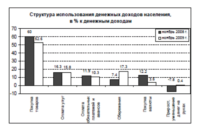 В ноябре 2009 г. денежные расходы населения составили 2 380,5 млрд. руб. и возросли относительно аналогичного периода предшествующего года на 1,3%. Превышение денежных доходов населения над расходами составило 10,0 млрд. руб. Изменения в структуре денежных расходов населения за год - ноябрь 2009 г. относительно ноября 2008 г. - можно оценить как достаточно заметные.