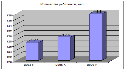 Большая часть имущества ООО СКФ представлена оборотными активами. На долю оборотных средств приходится в среднем 96,9%, но и доля основных средств предприятия неуклонно растет (на конец 2006 года удельный вес необоротных активов в имуществе предприятия составил 4,1 % против 1,3% в 2004 году). Предприятие характеризуется устойчивым ростом численности персонала (рис 1.1.).
