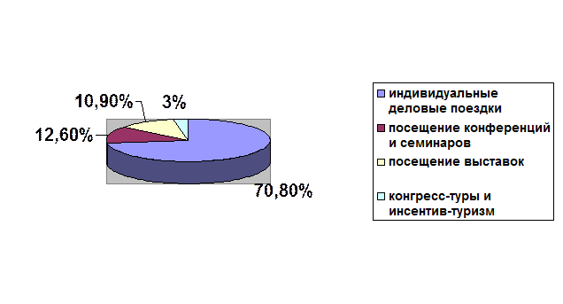 Всемирная туристская организация давно уже подсчитала: люди в бизнес поездках тратят в поездках в три-четыре раза больше, чем обычные граждане на отдыхе ($1200 вместо $300). Сегмент рынка делового туризма имеет очень весомое значение. Шестьдесят процентов мирового туризма приходится на деловой туризм. От 55% до 60% мест в отелях по всему миру заполняется как раз за счет деловых поездок. Этот динамичный рынок обеспечивает ежегодно 610 млн. деловых поездок и почти $430 млрд. финансового оборота. В структуре мирового бизнес туризма преобладают индивидуальные деловые поездки (70,8%). Примерно в равных долях - поездки на конференции и семинары (12,6%) и посещение выставок (10,9%). Конгрессные туры и инсентив-туризм занимают приблизительно по 3% (приложение 1). В мировом туристическом потоке доля бизнес-туристов составляет примерно 25-30%.