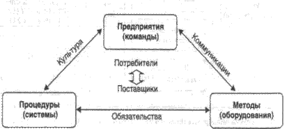 Рис. 2.3. Схема модели TQM Модель TQMбазируется на семи принципах новой концепции качества: 1.Качество — неотъемлемый элемент продукции. 2.Качество — это то, что говорит потребитель, а не производитель. 3.Ответственность за качество должна быть адресной. 4.Для реального повышения качества нужны новые технологии. 5.Повысить качество можно только усилиями всех работников предприятия. 6.Контролировать процесс всегда эффективнее, чем результат (продукцию). 7.Политика в области качества должна быть частью общей политики предприятия. Эффективность управления качеством на предприятии обеспечивается за счет выполнения следующих основополагающих условий: 1.Отношение к потребителю — важнейшая составляющая процесса управления. 2.Принятие руководством долгосрочных обязательств по внедрению процесса улучшения работы — составная часть системы управления предприятием. 3.Вера в то, что нет предела совершенству. 4.Уверенность в том, что предотвращение проблем лучше, чем реагирование на них, когда они возникают. 5.Заинтересованность, ведущая роль и непосредственное участие руководства. 6.Стандарт работы — "ноль ошибок". 7.Участие всех работников предприятия, как коллективное, так и индивидуальное. 8.Основное внимания обращается на совершенствование процессов, а не людей. 9.Вера в то, что поставщики станут нашими партнерами, если будут понимать наши задачи. 10. Признание заслуг. Всеобщее (тотальное) управление качеством определяется как эволюционная система, получившая развитие благодаря успехам в промышленности из-за постоянно улучшающихся товаров и услуг, направленных на удовлетворение покупателя в быстроменяющемся мире. Концепции TQMuметоды работы развивались в течение многих лет компаниями, ищущими пути улучшения качества своих продуктов и услуг. TQM нeявляется абстрактной философией. Не существует также единственно правильного способа внедрения TQM, он должен соответствовать культуре и истории каждой компании (рис. 2.4). Хотя каждая компания должна найти свой собственный способ внедрения TQM, существует четыре сферы концепции практических навыков, общих для самого успешного осуществления во многих компаниях, не занимающихся TQM. Они представляют собой четыре "прорыва" в управлении качеством: 1.Компании, использующие TQM, сосредоточивают внимание на покупателях и на удовлетворении их потребностей. Поэтому они должны быть в состоянии быстро реагировать на меняющийся покупательский спрос и концентрировать свои ограниченные ресурсы на деятельности, которая удовлетворяет покупателей. 2.Компании, использующие TQM, добиваются непрерывного усовершенствования процессов, которые ведут к более высокому качеству продуктов и услуг. Постоянное усовершенствование включает в себя использование научного подхода для достижения этой цели (анализировать факты, основывать действия на фактах, проверять результаты эмпирически); выполнение пошаговых улучшений, чтобы быстро выйти на рынок и приобрести реальный опыт; проведение повторяющегося усовершенствования для достижения более высоких уровней качества.