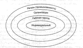 Рис. 2.4. Изменения в вопросе об управлении 3. Компаниям, использующим TQM, необходимо использовать возможности всех членов компании, если ей нужно добиться непрерывного усовершенствования и удовлетворения запросов покупателя. 4. Компании, использующие TQM, должны популяризовать свой опыт, т.е. делиться знаниями с другими компаниями, чтобы избежать повторного изобретения методов, быстрее реализовать понятие качества на практике и создать культуру качества ведения дела. В четырех "прорывах" в управлении качеством безусловно подразумевается необходимость практической деятельности TQMна четырех уровнях: индивидуальном, рабочей группы, организации и региональном (или промышленном) уровнях (рис. 2.5). В некоторой степени эти четыре уровня практики параллельны четырем революциям в мышлении. Индивидуальный уровень практики TQMнеобходим, чтобы ориентировать каждого работника на работу, направленную на удовлетворение запросов потребителя, и обеспечить его инструментами, необходимыми для выполнения этой задачи. Это дает каждому в компании представление о взаимоотношениях между покупателем и поставщиком. Если нужно удовлетворить запросы потребителя или следующий процесс, то от простого выполнения рутинной работы следует перейти на выполнение работы, связанной с усовершенствованием. Эффективное выполнение таких изменений возможно только на уровне системы.