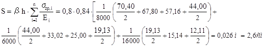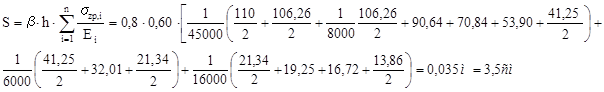 Граница глины и суглинка условно смещена до глубины zi = 3,36 м от подошвы (фактическое положение на глубине z = 3,35 м), а граница суглинка и глины смещена до глубины zi = 5,04 м от подошвы (фактическое положение на глубине z = 5,05). На глубине Hc = 6,72 м от подошвы фундамента выполняется условие СНиП 2.02.01-83 (прил.2, п.6) ограничения глубины сжимаемой толщи основания (ГСТ) szp= 12,11 кПа » 0,2×szg = 0,2×80,17 = 16,03 поэтому послойное суммирование деформаций основания производим в пределах от подошвы фундамента до ГСТ. Осадку основания определяем по формуле: