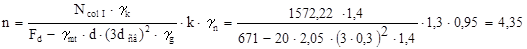 Осадку основания определяем по формуле: Условие S = 3,5 см < Su = 12,0 см выполняется (значение Su = 12,0 см принято по таблице прил.4 СНиП 2.02.01-83). Расчетная схема и эскиз фундамента на распределительной подушке приведена на рис.7. 6. Расчет и проектирование свайного фундаментаРассмотрим вариант свайного фундамента из забивных висячих свай сечением 300x300 мм, погружаемых дизельным молотом. 6.1 Глубина заложения подошвы ростверкаНазначаем глубину заложения подошвы ростверка: Расчетная глубина промерзания грунта от поверхности планировки DL равна df = 1,27 м. По конструктивным требованиям, также как и для фундамента на естественном основании верх ростверка должен быть на отметке – 0,700, размеры подколонника (стакана) в плане lcf x bcf = 2100 x 1200 мм, минимальная высота ростверка должна быть hr ³ dp + hp = 1250 + 500= 1750 мм = 1,75 м Для дальнейших расчетов принимаем большее из двух значений (1,27 и 1,75 м), т.е. hr = 1,8 м (кратно 150 мм), что соответствует глубине заложения –2,05м (абс. отм.63,35). 6.2 Необходимая длина свайВ качестве несущего слоя висячей сваи принимаем глину (слой 4), тогда необходимая длина сваи должна быть не менее: lсв = h1 + h2 + h3 = 0,05 + 5,05 + 1 = 6,1 м (рис.8) Принимаем типовую железобетонную сваю С7-30 (ГОСТ 19804.1-79*) квадратного сечения 300 х 300 мм, длиной L = 7 м. Класс бетона сваи В20. Арматура из стали класса А-III4 Æ12, объем бетона 0,64 м3, масса сваи 1,6 т, толщина защитного слоя ав = 20 мм. 6.3 Несущая способность одиночной сваиОпределяем несущую способность одиночной сваи из условия сопротивления грунта основания по формуле (8) СНиП 2.02.03-85: Fd = gC × (gCR × R × A + U ×ågcf × fi × hi). В соответствии с расчетной схемой сваи (рис.8) устанавливаем из табл.1 СНиП 2.02.03-85 для глины (IL = 0,2) при z = 8,1 м расчетное сопротивление R = 4788 кПа. Для определения fi расчленяем каждый однородный пласт грунта (инженерно-геологический элемент) на слои Li £ 2 м и устанавливаем среднюю глубину расположения zi каждого слоя, считая от уровня природного рельефа. Затем по табл.2 СНиП 2.02.03. -85, используя в необходимых случаях интерполяцию, устанавливаем: для глины при IL = 0,60 и z1 = 2,95 м Þf1 = 14,3 кПа для глины при IL = 0,60 и z2 = 4,625 м Þf2 = 16,8 кПа для суглинка при IL = 0,60 и z3 = 6,15 м Þf3 = 18,2 кПа для глины при IL = 0,20 и z4 = 7,95 м Þf4 = 62,1 кПа Площадь опирания сваи на грунт А = 0,3 х 0,3 = 0,09 м2, периметр U = 0,3 × 4 = 1,2 м. Для сваи сплошного сечения, погружаемой забивкой дизельным молотом, по табл.3 СНиП 2.02.03-85 gCR = gCf =1, gС = 1. Тогда: Fd =1× [1×4788×0,09 + 1,2×1×(14,3×2,0 + 16,8×1,35 + 18,2×1,7 + 62,1×1,90)] = 671 кН 6.4 Требуемое число свайОпределяем требуемое число свай в фундаменте в первом приближении при NcolI =1572,22 кН