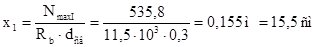 Граничное значение относительной высоты сжатой зоны по табл.2.2 п.2.3.12, учебного пособия, составляет для стали А-Ш и бетона В20 xR = 0,591 При x1 = 15,5 см для дальнейшего расчета. Проверяем прочность сечения сваи по формуле (36) СНиП 2.03.01-84:
