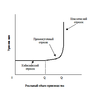 Рис. 1. Кривая совокупного спроса. Эффект процентной ставки предполагает, что траектория кривой совокупного спроса определяется воздействием изменяющегося уровня цен на процентную ставку, а следовательно, на потребительские расходы и инвестиции. Когда уровень цен повышается, повышаются и процентные ставки, а возросшие процентные ставки, в свою очередь, приводят к сокращению потребительских расходов и инвестиций. Эффект богатства, или эффект реальных кассовых остатков предполагает, что при более высоком уровне цен реальная стоимость, или покупательная способность, накопленных финансовых активов, в частности активов с фиксированной денежной стоимостью, таких, как срочные счета или облигации, находящихся у населения, уменьшится. В таком случае население реально станет беднее, и поэтому можно ожидать, что оно сократит свои расходы. И, наоборот, при снижении уровня цен реальная стоимость, или покупательная способность, материальных ценностей возрастет и расходы увеличатся. Эффект импортных закупок приводит к уменьшению совокупного спроса на отечественные товары и услуги при повышении уровня цен. И наоборот, сравнительное уменьшение уровня цен способствует сокращению импорта и увеличению экспорта и тем самым увеличению чистого объема экспорта в совокупном спросе.[8, с.254] Совокупное предложение Совокупное предложение - это модель, представленная в виде кривой, которая показывает уровень наличного реального объема производства при каждом возможном уровне цен. Более высокие уровни цен создают стимулы для производства дополнительного количества товаров и предложения их для продажи. Более низкие уровни цен вызывают сокращение производства товаров. Зависимость между уровнем цен и объемом национального продукта, который предприятия выбрасывают на рынок, является прямой, или положительной. Кривая совокупного предложения состоит из трех отрезков: 1) кейнсианский (горизонтальный) отрезок, 2) классический (вертикальный) отрезок, 3) промежуточный (отклоняющийся вверх) (рис. 2). Кейнсианский отрезок означает, что экономика испытывает спад производства; здесь невозможно стимулирование производства за счет роста цен. Классический отрезок означает, что в экономике достигнута полная занятость и соответственно полный объем производства; рост уровня цен не может обеспечить увеличение предложения товаров и услуг.