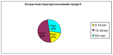 Вывод: 1. При сравнении обеспеченности врачами области и города Н можно отметить, что несмотря на то, что в обозреваемые годы количество врачей в городе Н увеличивается (хотя и не стойко), в области их на настоящий момент больше. 2. В городе Н отмечается стойкая отрицательная динамика обеспеченности койками населения города Н на 10000 населения. Городским управлением здравоохранения при участии экспертов-специалистов проведено изучение состояния здоровья населения. Полученные результаты представлены ниже. В городе Н. проживает 100 000 человек, в том числе в возрасте до 15 лет – 20 000, от 15 до 49 лет – 50 000 (в том числе женщин – 23 000), 50 лет и старше – 30 000 человек. Диаграмма 1.б. Возрастная структура города Н