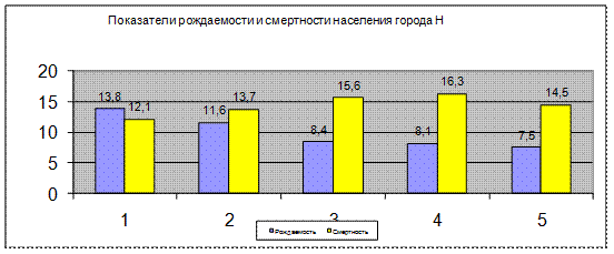 Вывод: На основании структуры населения за прошедший год наблюдается регрессивный тип демографии населения, так как совокупность населения в возрасте от 0 до 15 лет меньше чем совокупность населения старше 50 лет. В изучаемом году в городе родилось живыми 750 детей (в предыдущем 780), все у женщин в возрасте 15 - 49 лет. Умерло за год 1450 человек, в том числе в возрасте до 1 года – 11. Данные о динамике демографических показателей в городе за изучаемый период с 1 года наблюдения по 5 представлены в табл. 2. Таблица 2. Динамика демографических показателей города Н. за 5 лет и в сравнении с РФ (на 1000)