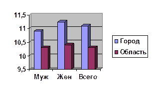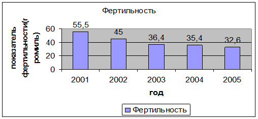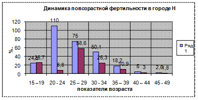 Вывод: За время учетного периода младенческая смертность в городе Н снизилась, однако смертность в городе Н все еще больше, чем в области, где традиционно оборудование и профессионализм родильных домов, а так же больниц несравнимо хуже, чем в городе. За последние годы ухудшилась социально-экономическая обстановка в городе. Прекратилось строительство жилья, сократился выпуск продукции промышленных предприятий, происходит уменьшение числа лиц, занятых в общественном производстве. Отмечено увеличение количества разводов и снижение числа браков. Относительно увеличилось число детей, рожденных женщинами, не состоящими в браке (каждая пятая из них не достигла 20 лет). Обнаружены значительные изменения в показателях повозрастной фертильности (табл. 3). Таблица 3. Динамика повозрастной и общей фертильности в городе Н.(на 1000 женщин фертильного возраста и в абс. числах и на 1000)