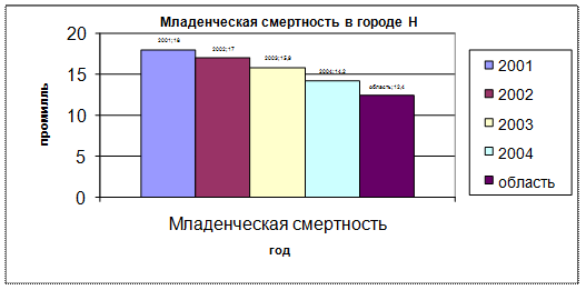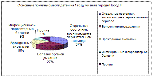 Вывод: 1. Первое место по распространенности заболевания занимают болезни кровообращения. Во всех странах и городах мира, а не только в городе Н. Однако, при увеличении городом Н средств, выделяемых на улучшения здоровья населения можно было бы путем общих укрепляющих процедур (как занятия спортом, реклама здорового образа жизни, санитарно-курортного лечения) можно было бы добиться увеличения общей продолжительности жизни, а так же уменьшение абсолютного количества заболеваемости болезнями системы кровообращения, особенно среди населения моложе 45 лет (показатель которых в последние 5 лет начал неуклонно расти). 2. Второе место по распространенности заболеваний заняли злокачественные новообразования. Однако, при увеличении средств выделяемых городским бюджетом города Н можно было бы снизить абсолютное число смерти от новообразований за счет ранней диагностики и своевременного лечения с помощью новейшего оборудования. 3. На третьем месте по распространенности заболевание заняли несчастные случаи и отравления – скорее всего за счет увеличения безработицы и ухудшения социально-экономического положения в городе Н. Сокращение бюджета систем безопасности при данной обстановке, еще больше усугубляет создавшуюся ситуацию. Таблица 5. Основные причины смерти детей на 1-ом году жизни в г. Н и РФ (абс. числа и в % к итогу).