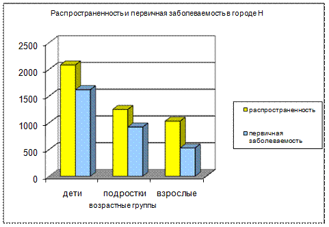Распространенность и первичная заболеваемость среди различных возрастных групп города Н. (на 1000)