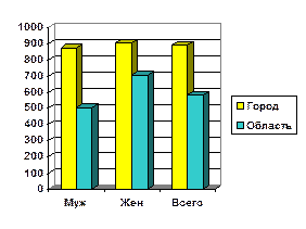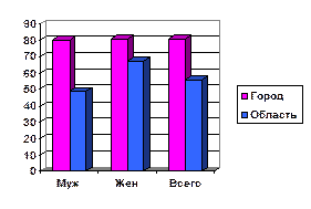 Вывод: Данные по распространенности и первичной заболеваемости среди населения указывают на то, что показатели распространенности и первичной заболеваемости в городе Н. среди детей, подростков и взрослых ниже, чем в области. Это может быть вследствие влияния следующих факторов: 1) доступность медицинской помощи в г.Н по сравнению с областью выше; 2) низкая культура населения в области; 3) недостаточные количество и квалификация врачей и среднего мед. персонала; 4) недостаточное количество лечебных учреждений и медицинской техники ; 5) низкий уровень жизни в области; В лечебно-профилактических учреждениях г. Н, изучается заболеваемость с временной утратой трудоспособности (ЗВУТ) работающих. Были проанализированы показатели ЗВУТ как по данным ф. 16-ВН, так и по отдельным контингентам (по методу полицевого учёта). Таблица 8. Показатели ЗВУТ работающих в зависимости от пола в г. Н и области за изучаемый год.