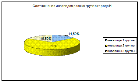 Вывод: Число случаев и число дней нетрудоспособности среди населения города Н. превышает областные значения, но преобладают среди населения города Н.и области – женщины, средняя длительность случая больше, чем в области В поликлинике всего зарегистрировано: У мужчин: случаев – 12800; дней - 140000 средняя годовая численность работающих мужчин - 16000 У женщин: случаев – 15300; дней - 172000 средняя годовая численность работающих женщин – 19000 Для планирования мероприятий по социальной защите инвалидов г. Н были изучены показатели первичной инвалидности в связи с заболеваниями и травмами (табл. 9). Всего было впервые установлено 826 случаев, из них: инвалидов 1 группы –120; 2 гр. –570; 3 гр. - 136.