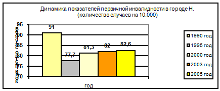 Вывод: Пик показателей первичной инвалидности приходится на 1990 год, достигая значений 91. Случай первичной инвалидности на 10.000 населения, вплоть до 1995 года отмечается резкий спад показателей до 77.7, а с 1995 по 2005 отмечается неуклонный рост случаев, достигших к 2005 году значения 82,6 случая на 10.000 населения города Н. Таблица 10. Основные заболевания, приводящие к первичной инвалидности населения г.Н. в изучаемом году и РФ (абс. числа и в % к итогу).