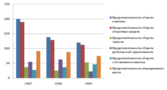 По данным таблицы 2.4 видно, что деятельность ООО «Лидер» можно оценить кaк достаточно активную: значения многих показателей выросли. Увеличилась прибыль, что свидетельствует oб относительном снижении издержек обращения. Рост фондоотдачи и производительности труда характеризует анализируемое предприятие с положительной стороны. Произошло ускорение оборачиваемости оборотного капитала. Это произошло за счет ускорения оборачиваемости денежной наличности. Ускорилась оборачиваемость оборотных средств, дебиторской задолженности и кредиторской задолженности (рисунок 2.4).