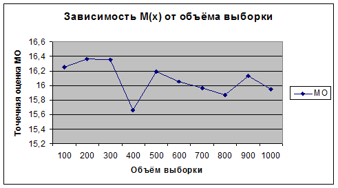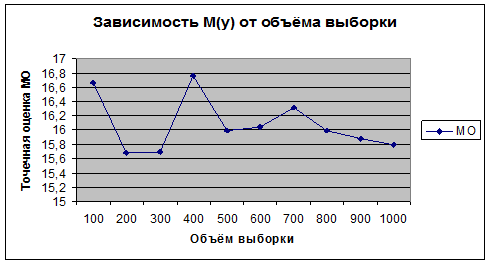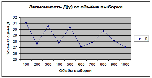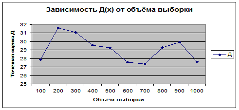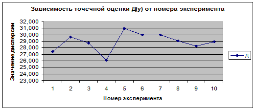 Рисунок 2.32 - Зависимость В таблице 2.9 приведены оценки математического ожидания и дисперсии, вычисленные для 10 выборок по 1000 элементов в каждой для случайной величины Таблица 2.9 – Точечные оценки выборок из 1000 элементов для