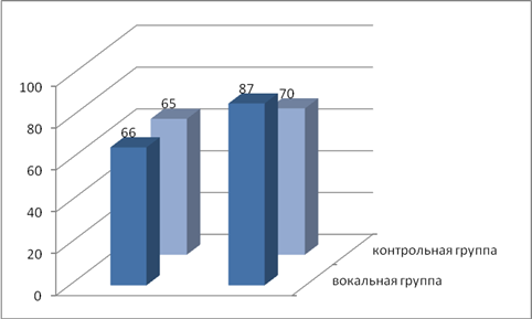 Рисунок 1. Диагностика интеллектуальных способностей Таким образом, посредством стандартизированных интеллектуальных тестов выявились группы детей с высоким и выше среднего уровнем мышления. На момент начала обучения количество учащихся с высоким и средним уровнем интеллекта в вокальной и контрольной группах было практически одинаковым (66% и 65%). В конце первого года обучения показатели уровня развития интеллекта значительно выше у детей, занимающихся в вокальной группе. Дети успешно овладели логическими операциями: анализ, синтез, классификация, обобщение. В шестых и седьмых классах было проведено анкетирование учащихся по выявлению интересов к учебным предметам. По сравнению с предметами математики, русского языка, литературы, физической культуры ученики отдают предпочтение уроку музыки. Это свидетельствует о достаточно высоком уровне развития учебной мотивации к данному предмету (см. Рис.3).