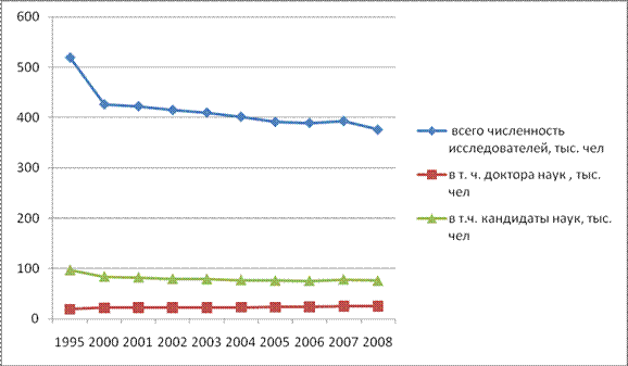 Исследования показывают, что в целом инновационная активность отраслей и технологических комплексов в стране остается на низком уровне. Для адаптации к сложившейся хозяйственной ситуации только небольшая часть предприятий осуществляла организационные инновации (управленческие изменения), оказавшие влияние на развитие таких направлений, как «обеспечение производства современными стандартами», «улучшение качества продукции». Организации федеральной собственности активнее организаций собственности субъектов РФ настраиваются на современную хозяйственную ситуацию. Это важнейшая характеристика инерционности системы управления инновационными процессами, которая находится все еще в начальной стадии формирования. Решение основных проблем инновационного развития перемещается в сферу организационной и мировоззренческой культуры, которая формирует качество труда во всех сферах жизнедеятельности. Анализ уровней затрат и результативности инновационных процессов за период 2000-2008 гг. оказал, что между ними прослеживается только слабоположительная взаимосвязь, а сами значения практически остаются стабильными на протяжении этих лет, либо даже снижаются. Так, численность исследователей сократилась на 11,8% (с 426 тыс. чел. в 2000 г. до 375,8 тыс. чел. в 2008 г.), а доля в ВВП затрат на исследования и разработки в 2008 г. составила всего 1,03 %, меньше чем все предыдущие годы. Количество ежегодно создаваемых передовых производственных технологий осталось практически неизменным. Обращает на себя внимание устойчивая тенденция более чем двукратного превышения импорта технологий над их экспортом, что объясняется неполным восстановлением потенциала отечественного инновационного сектора, а также более высоким уровнем конкурентоспособности и завершенности ряда зарубежных технологий.[3, статья] Нынешняя ситуация в отечественной науке создает угрозу национальной безопасности России. У ведущих стран Запада расходы на НИОКР составляют 2-3% ВВП, в том числе в США-2,7%, а у таких стран, как Япония, Швеция, Израиль, достигает 3,5-4,5% ВВП. У России этот показатель составляет примерно 1% ВВП.[5, 2-3]. Продолжение деградации научного потенциала страны привело к тому, что Россия остается единственной крупной страной в мире с сокращающейся численностью ученых. Сложившаяся ситуация – это результат применения в России неолиберальных экономических концепций, согласно которым любое государственное вмешательство в экономику ведет к негативным последствиям. Такая вера в «невидимую руку рынка» затронула и государственную политику в научной сфере. Фактически научной политики в России нет. Состояние образования явно не соответствует требованиям перевода страны на инновационный курс развития. В последнее время наметились определенные позитивные сдвиги в области образования. Безусловно, компьютеризация школ, создание исследовательских и национальных университетов, увеличение финансирования высшего образования и т.д. плодотворно скажутся на всей системе образования. Однако в этих шагах не просматривается системный подход к обеспечению инновационного пути развития страны. Главным препятствием для инновационного развития страны является бессубъективность, отсутствие субъекта инновационного развития, осознающего свои цели, интересы, стратегию и тактику