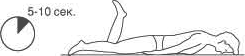 3. Положение лежа на спине. Выпрямленная нога отрывается от пола на высоту 20-30 см и удерживается в таком положении несколько секунд, затем опускается. То же движение повторяется другой ногой. Повторить 20-30 раз. 4. Положение лежа на спине, ноги вытянут. Вытянуть руки вперед и постараться поднять голову и верхнюю часть туловища на высоту 20 си от пола, затем опустить. Повторить 10 раз.