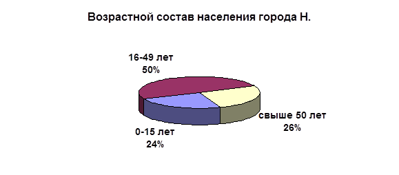 В городе Н. проживает 100000 человек, в том числе в возрасте 0-15 лет - 24000 чел., 16-49 лет - 50000 чел., 50 лет и старше - 26000 чел. Диаграмма 2