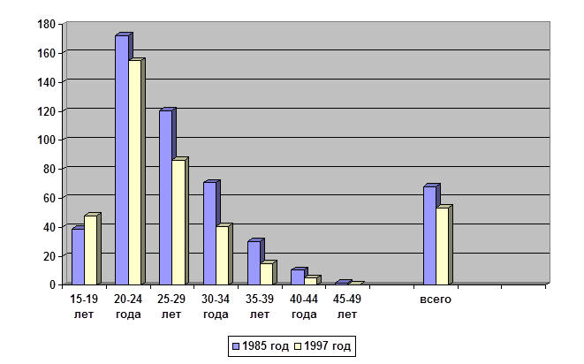 Из диаграммы видно, что по сравнению с 1985 годом снизилась общая плодовитость и плодовитость во всех возрастных группах, кроме группы 15-19-летних, где плодовитость повысилась. Такие изменения могут быть вызваны снижением уровня жизни в городе Н., ухудшением социально-экономической обстановки и ее нестабильностью (это вызвало снижение общей плодовитости), результатами “сексуальной революции” (повышение плодовитости среди 15-19-летних).