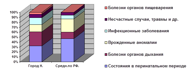 Основные причины смерти детей на 1-м году жизни в городе Н. - это болезни органов дыхания (28,6%), состояния, возникшие в перинатальном периоде (32,2%), врожденные аномалии (14,3%), инфекционные и паразитарные болезни (14,3%), несчастные случаи, отравления, травмы (7,1%), болезни органов пищеварения (3,5%). Причины младенческой смертности в Российской Федерации за 1996 год выглядят следующим образом: 1.состояния, возникшие в перинатальном периоде 43%. 2.врожденные аномалии 23,7%. 3.болезни органов дыхания 12,7%. 4.инфекционные и паразитарные болезни 7% 5.несчастные случаи и отравления 5,4% Соотношение показателей причин младенческой смертности в городе Н. и в Российской Федерации представлено на диаграмме 5. Диаграмма 5 Причины смертности детей 1-го года жизни в городе Н. по сравнению с аналогичными в среднем по РФ.