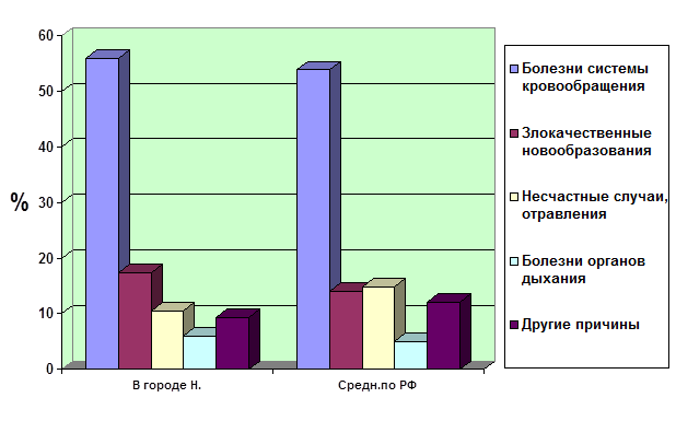 Таблица 6а Структура причин смерти в 1996 году в РФ: Причины смерти Доля Болезни системы кровообращения 53,9% Новообразования 14,1% Травмы 14,9% Болезни органов дыхания 5,0% Прочие 12,1% Данные таблиц 6 и 6а представлены на диаграмме 6. Диаграмма 6 Основные причины смерти населения города Н. в изучаемом году по сравнению с аналогичными в среднем по РФ.