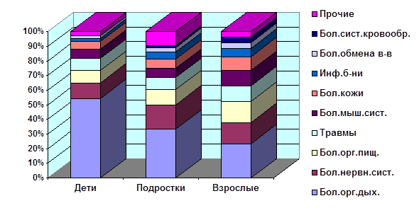 -х)* - менее 1%, можно пренебречь. Диаграмма 7. Структура общей заболеваемости детей, подростков и взрослых за 1997 год в городе Н.