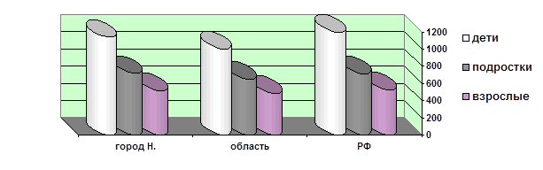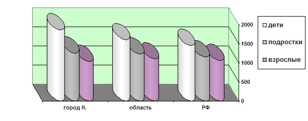 Диаграмма 8. Распространенность заболеваний среди детей, подростков и взрослых города Н., области и Российской Федерации за изучаемый год (на 1000).