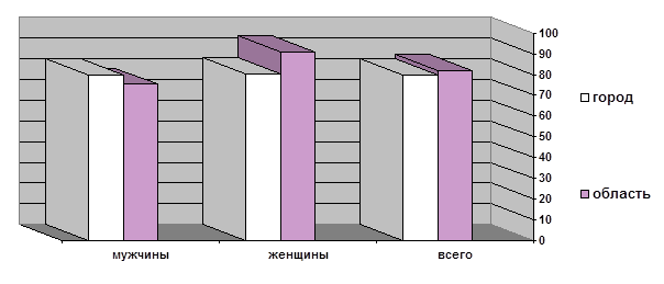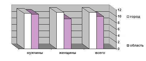 Из диаграммы видно, что самое большое число дней нетрудоспособности у женщин в городе. По области показатели меньше, но женщины все равно лидируют и там. Диаграмма 9б Средняя длительность случаев временной нетрудоспособности в городе и в области.