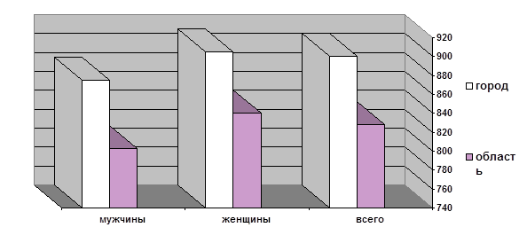 Узнаем, связана ли частота раннего прикорма и искусственного вскармливания с частотой желудочно-кишечных заболеваний. Для этого найдем коэффициент корреляции - величину, показывающую, насколько одни показатели зависят от других. Воспользуемся для его нахождения методом Спирмена (метод определения коэффициента ранговой корреляции КрК): 6 å d 2 6 (1+1) КрК = 1 - -¾¾¾¾ = 1 - -¾¾¾¾ = 1 - 0,2 = +0,9. (n-число наблюдений) n (n 2 -1) 5 (5 2 - 1) Поскольку КрК=+0,9, то зависимость сильная, прямая (то есть чем больше один показатель, тем больше другой). Узнаем, насколько достоверно полученное значение коэффициента корреляции: Рассчитаем ошибку коэффициента корреляции: 1 - KpK2 1 - 0,81 mp = Ö --------------- =Ö -----------= ± 0,25% n - 2 5-2 Определим достоверность КрК: КрК. 0,9 t = -¾¾¾¾ = ¾¾¾¾ =3,6. mp 0,25 т.к. t > 3, вероятность безошибочного прогноза - 99%. Отсюда следует, что между частотой раннего прикорма, искусственного вскармливания и частотой желудочно-кишечных заболеваний существует прямая, сильная, достоверная связь. Заключение Городским медицинским управлением совместно с сотрудниками ЛРУ проведено изучение состояния здоровья населения города Н. Проведен расчет и анализ демографических показателей заболеваемости, физического развития; проведен ряд статистических расчетов. 1. В городе Н. в 1997 году возросли показатели обеспеченности врачами и койками на 10.000 населения, однако эти показатели ниже, чем среднеобластные. Также видно, что темпы роста штата врачей опережают темпы роста коечного фонда. Остаются актуальными вопросы правильного планирования медицинской помощи населению и подготовки медицинских кадров. 2. При изучении структуры населения выявлено, что в городе Н. стационарный тип структуры населения с тенденцией к регрессивному. 3. При изучении демографических показателей в городе Н. за 1997 год выявлен ряд неблагоприятных тенденций: повысился показатель смертность, снизился показатель рождаемости, снизился показатель естественного прироста, вырос показатель младенческой смертности и снизился показатель плодовитости. При изучении графиков рождаемости, смертности, естественного прироста, плодовитости, младенческой смертности можно сделать вывод, что показатель естественного прироста падал и раньше,но за последние 7 лет его падение было особенно серьезным. Показатель плодовитости начиная с 1975 года по 1985 год рос, однако к 1997 году он упал ниже уровня 1975 года. Показатель младенческой смертности 1975 год по 1990 год падал, однако с 1990 года по 1997 год он незначительно вырос. Показатели рождаемости и плодовитости начиная с 1975 года постепенно падали, а показатель смертности рос. Таким образом, можно сделать заключение о неблагоприятной демографической ситуации, сложившейся в городе Н, которая, безусловно, зависит от состояния здоровья населения города Н. 4. Отмечен также ряд определенных негативных изменений при изучении показателей повозрастной общей плодовитости. Показатель общей плодовитости снизился в изучаемом году по сравнению с 1985 годом, однако стало больше количество родивших женщин от 15 до 19 лет. Пик плодовитости в 1997 году приходится на группу женщин от 20 до 24 лет. Можно сделать вывод о том, что в общем числе новорожденных растет доля детей, рожденных от более молодых матерей, т.е. от 15 до 24 лет. 5. При изучении причин смерти населения города Н. выявлено, что на первом месте стоят боле