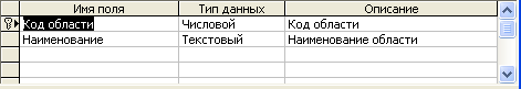 Таблица-справочник «Области » имеет поля: Код области – формат числовой, поле является ключевым. Наименование – формат текстовый, 50 символов. Вид таблицы при проектировании: