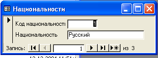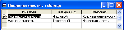 Таблица-справочник «Национальности » имеет поля: Код национальности – формат числовой, поле является ключевым. Национальность – формат текстовый, 50 символов. Вид таблицы при проектировании:
