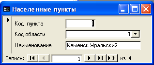 Форма населенные пункты используется для ввода данных по населенным пунктам. Поле код области выполнено в виде выпадающего списка из двух колонок код и наименование области.
